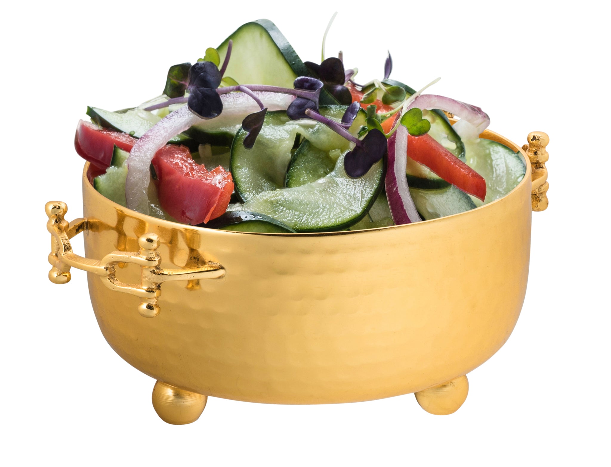A beautifully, hammered, polished stainless steel bowl that brilliantly elevates simple deli containers into elegant dishes!